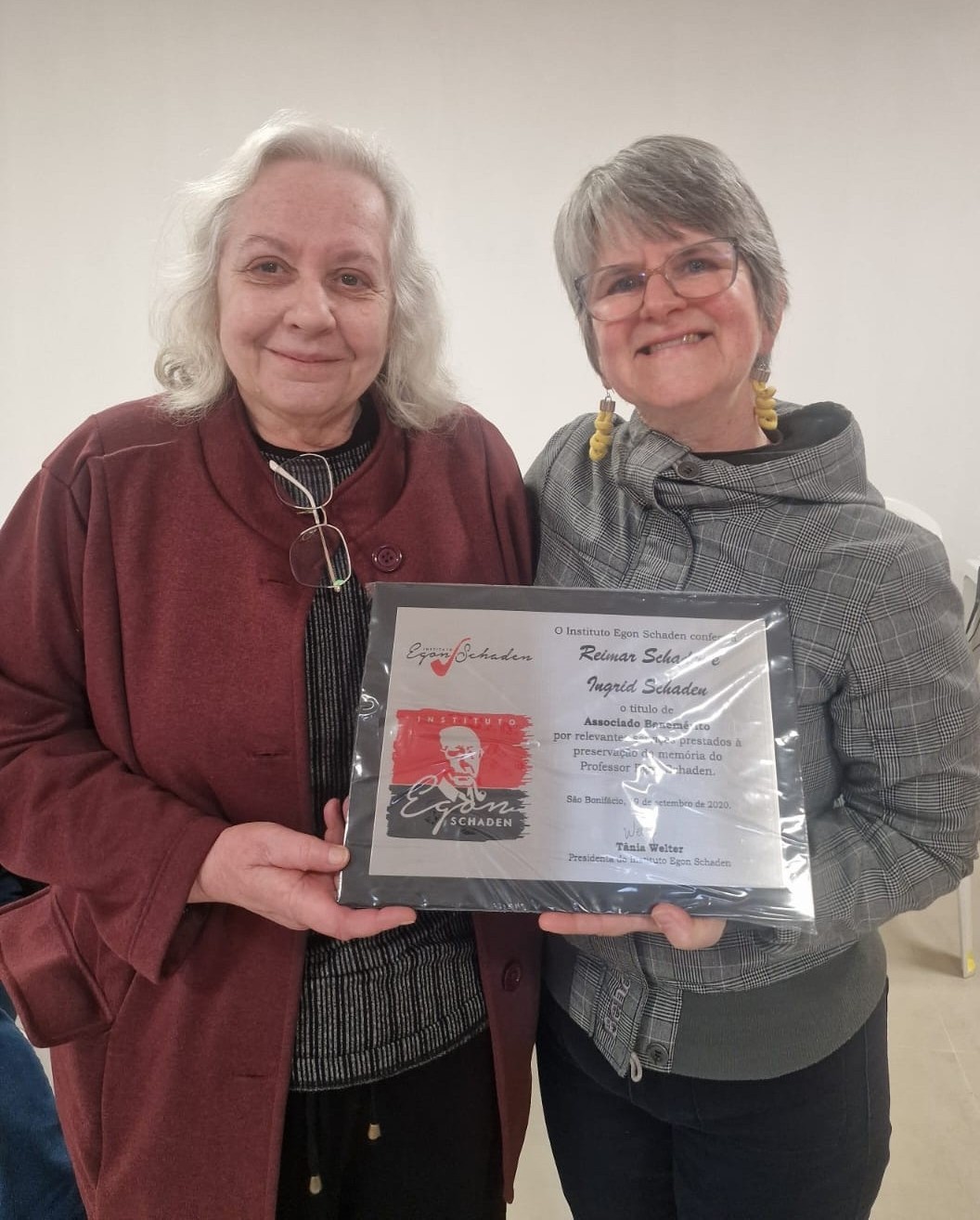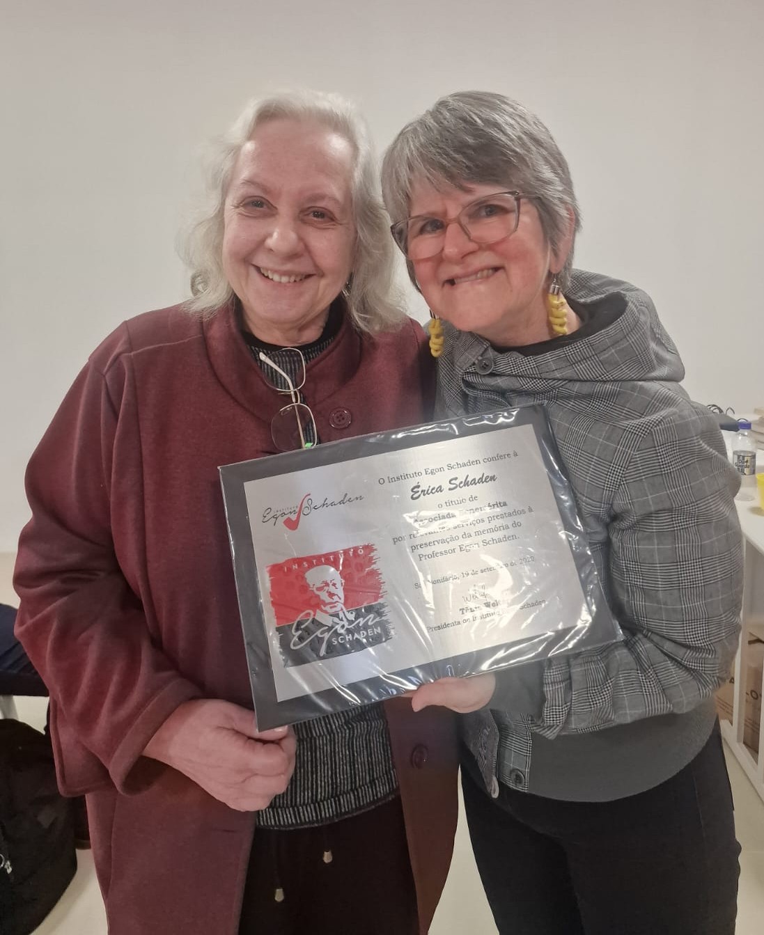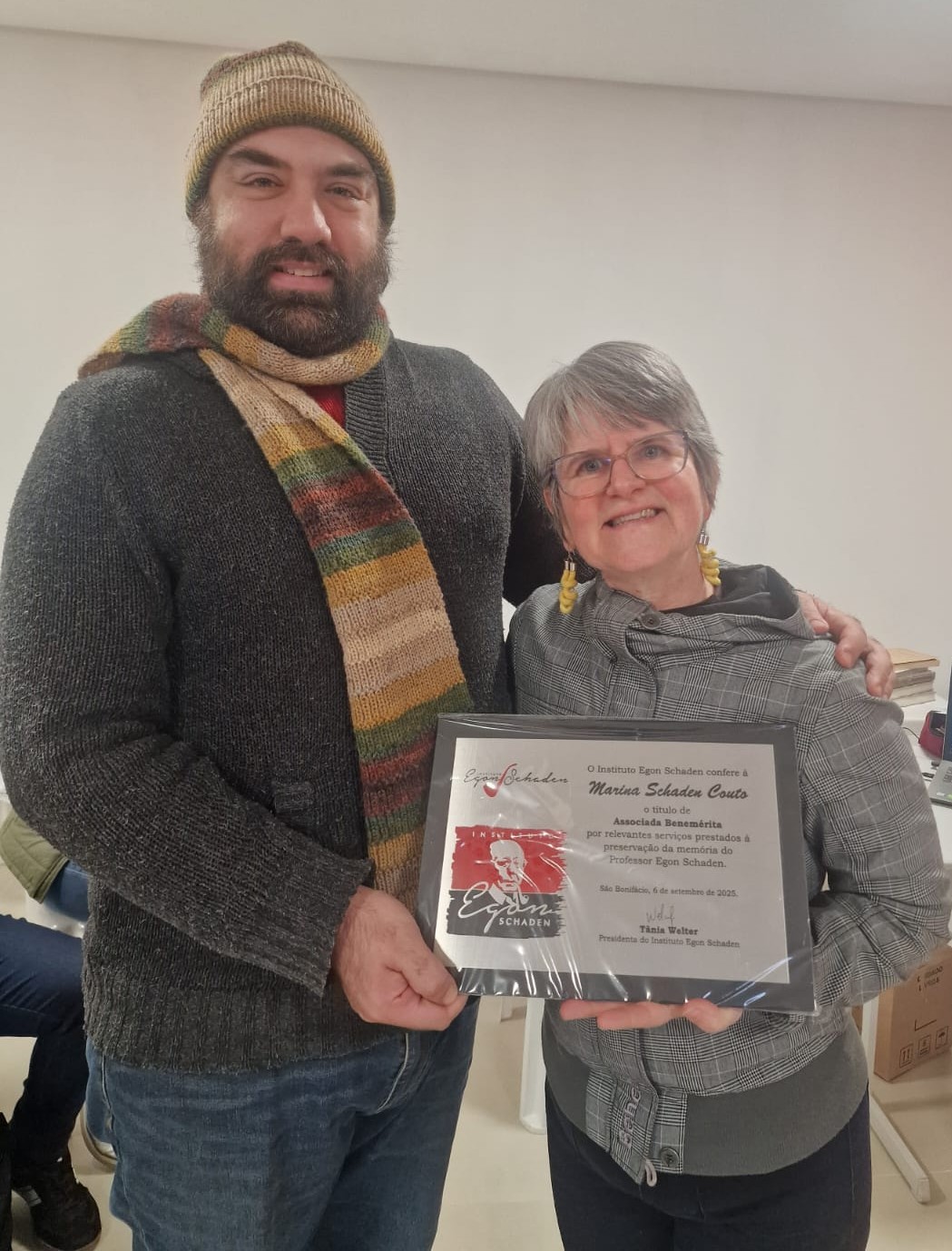 Como primeiro destaque, foi proposta a outorga do título de Associada Benemérita do IES à Marina Schaden Couto, filha do Professor Egon Schaden. Uma vez defendida e aprovada a proposição, a placa alusiva foi entregue ao filho da homenageada, Camilo Schaden, neto de Egon Schaden.
